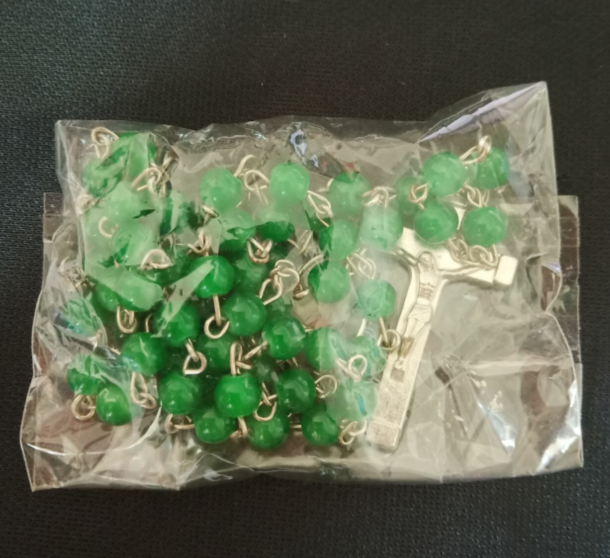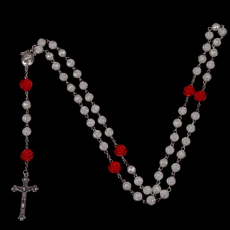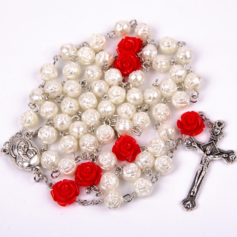 8 mm Cream Plastic Rose Beads Catholic Rosary with Red Flower Religious Cross Necklace