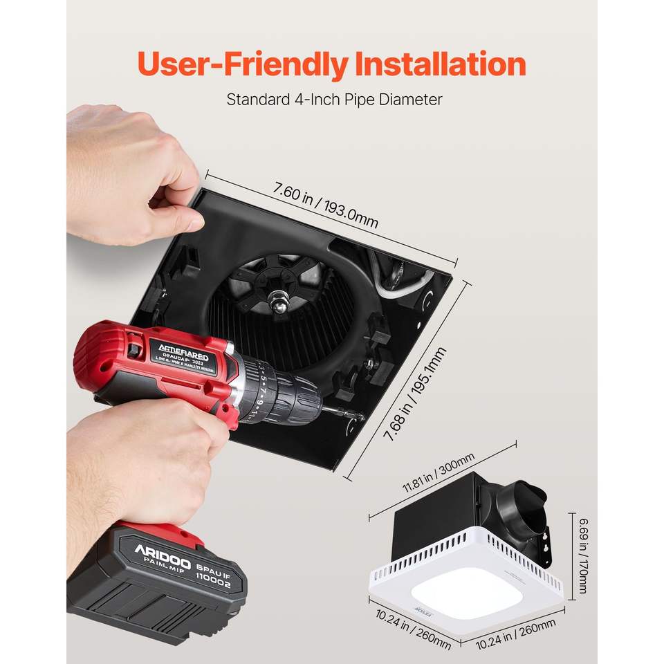 Ventilatore da bagno da 80 CFM con luce LED, temperatura colore 1.5 Sones, motore AC premium silenzioso, a soffitto, con tre velocità di ventilazione