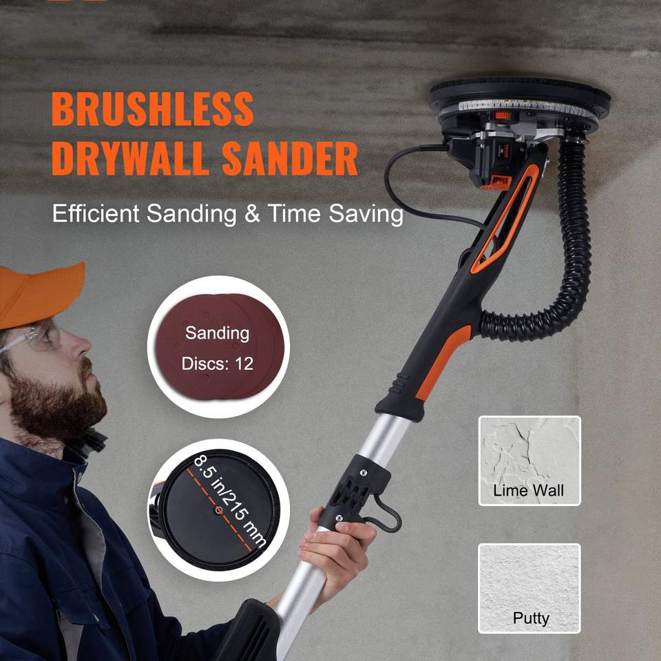 Levigatrice Elettrica per Cartongesso con Motore Brushless da 800W, Velocità Variabile 1000-2300 RPM, Levigatrice Pieghevole per Soffitti e Pareti