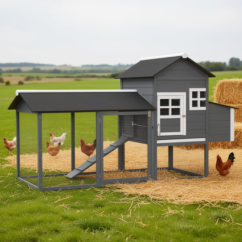 Pollaio in legno da 84 pollici grigio con recinto coperto, nido e posatoi per galline