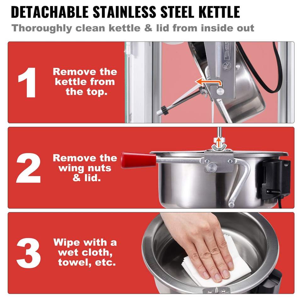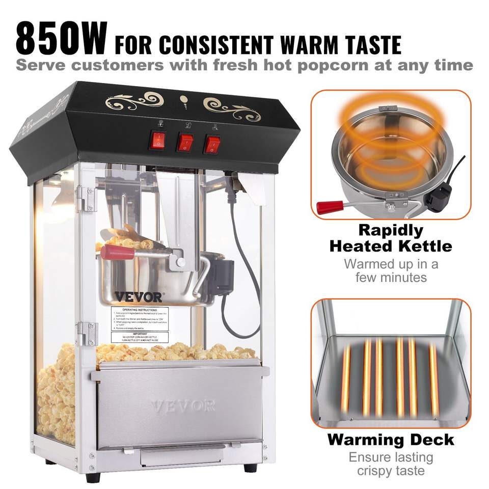 Macchina per Popcorn da Banco 850W, Pentola da 8 Oz, 48 Tazze per Ciclo, con Vetro Temperato