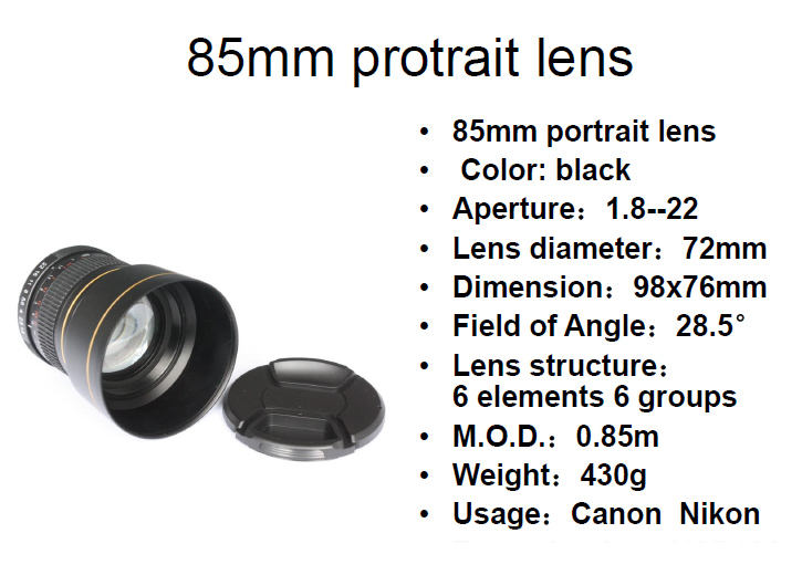 Obiettivo fotografico a fuoco fisso 85mm F1.8-22 con diametro del filtro da 72mm, compatibile con attacco Canon Nikon Sony E per ritratti di alta qualità