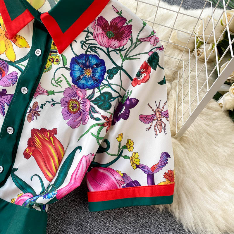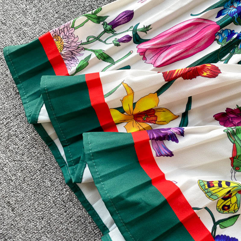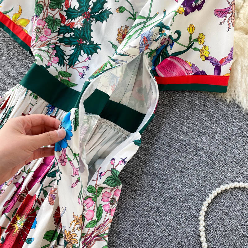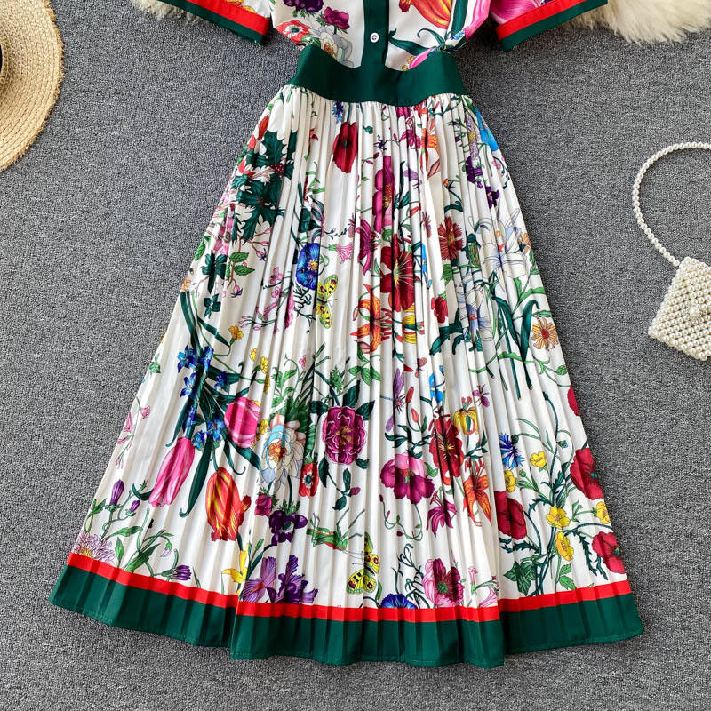 8610 # Abito Plissettato da Passerella Estiva, Vestito Midi da Donna con Maniche Corte, Colletto a Camicia, Stampa Floreale, Slim Fit per Feste