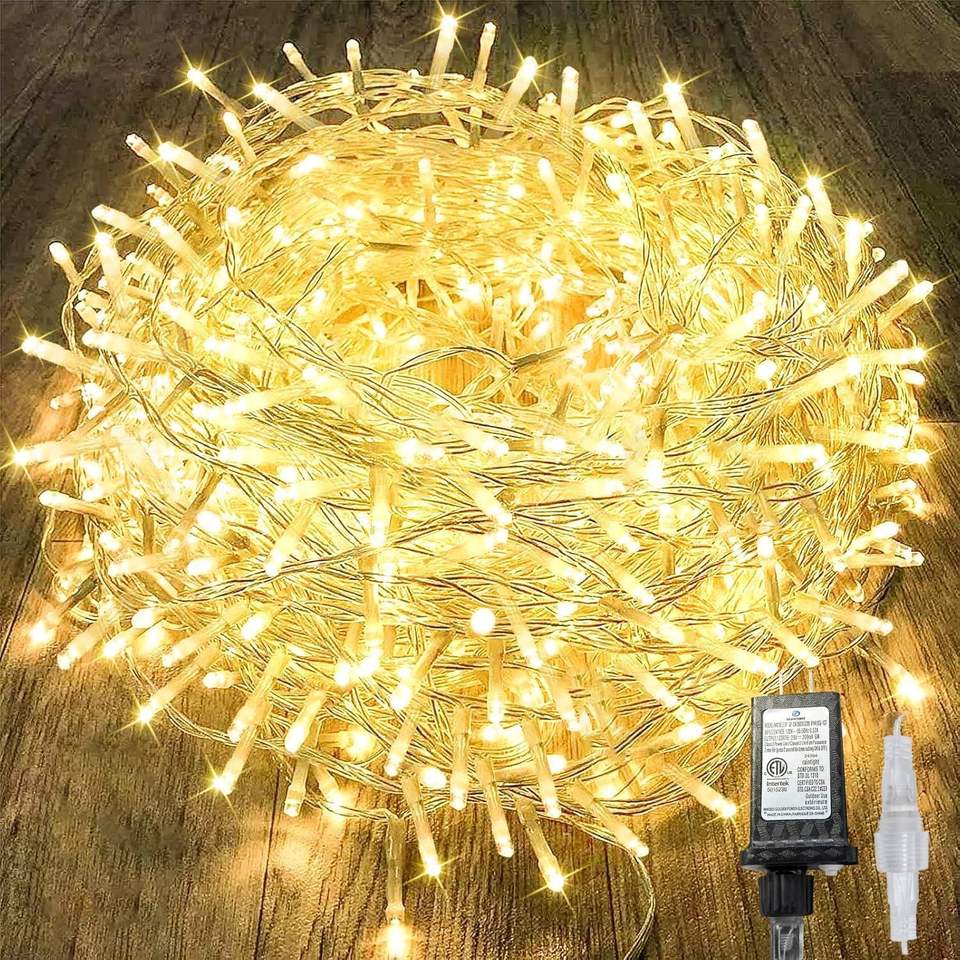 Luci a stringa da 240 LED collegabili per interni ed esterni, 27 metri, con cavo trasparente e luci natalizie a LED bianco caldo, con spina.