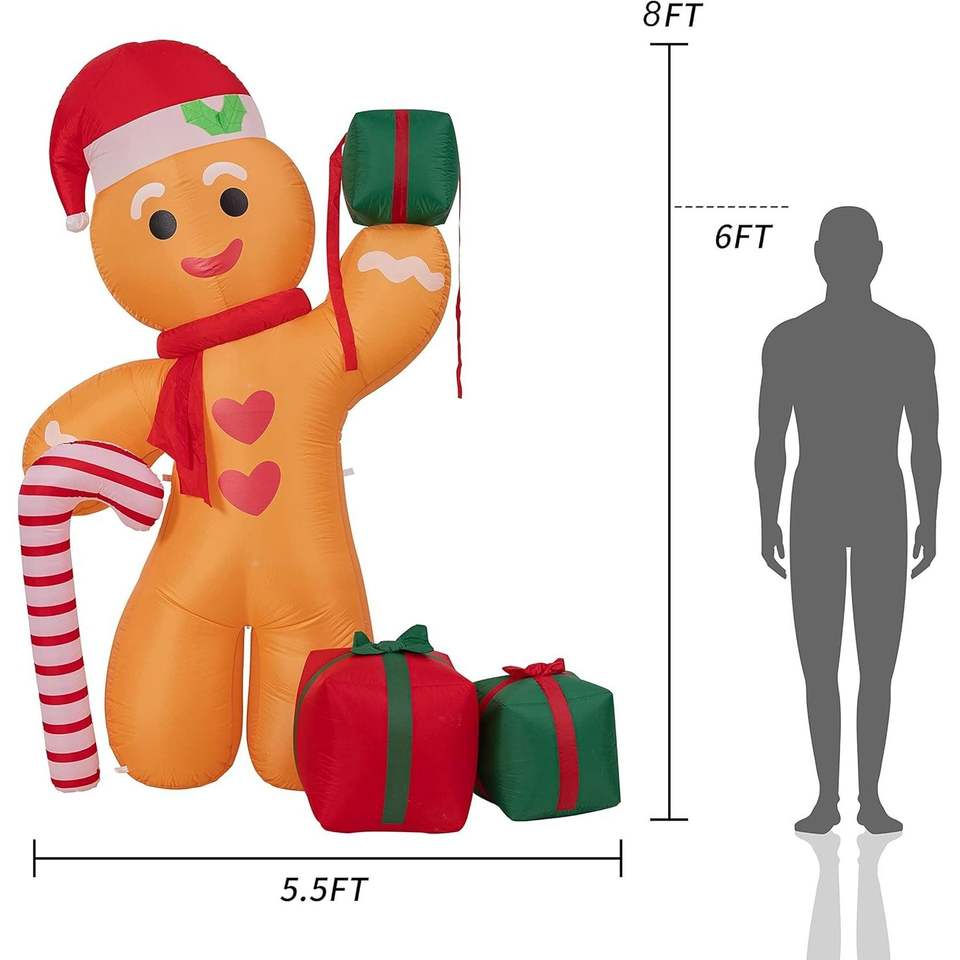 Omino di Pan di Zenzero Gonfiabile LED da 2,4 m con Bastoncino di Zucchero e Tre Scatole Regalo, Decorazione per Interni ed Esterni, Addobbi Natalizi da Giardino