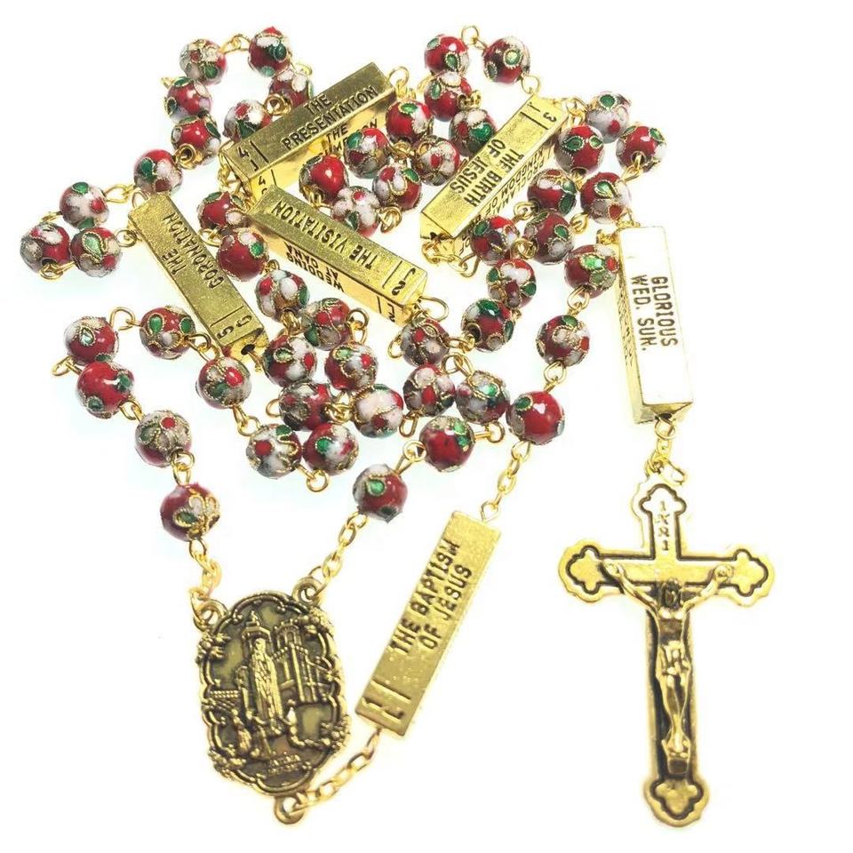 8mm Golden Chain and Antique Gold Connectors Red Cloisonne Rosary Necklace With Five Mysteries