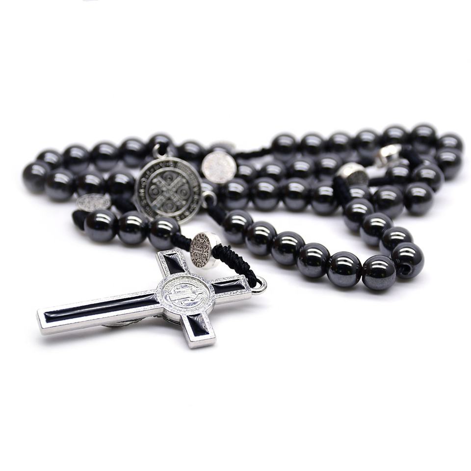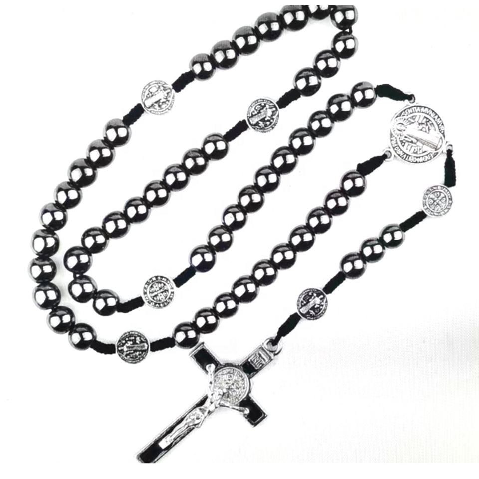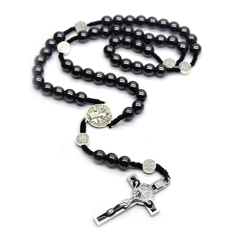 Perline di ematite da 8mm rosario di cordoncino di san benedetto collana con croce religiosa rosari intrecciati neri cattolici