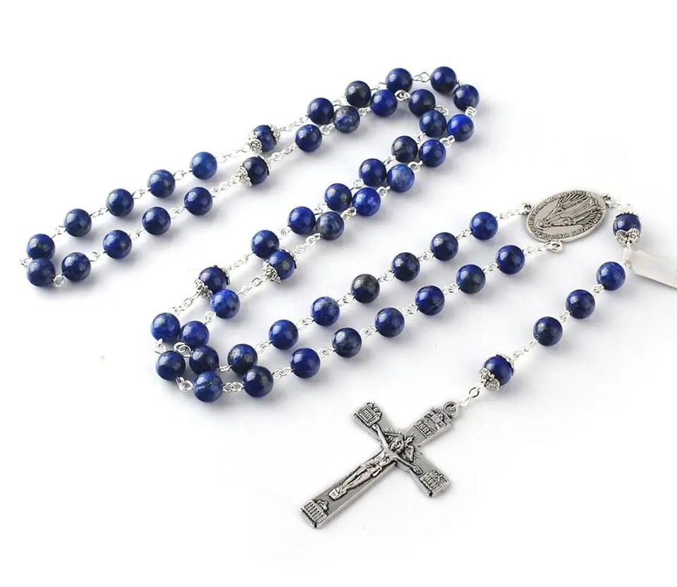 Rosario Cattolico con Perle di Lapislazzuli da 8mm, Tappi sulle Perle del Padre Nostro, Medaglia della Madonna e Crocifisso in Argento Anticato
