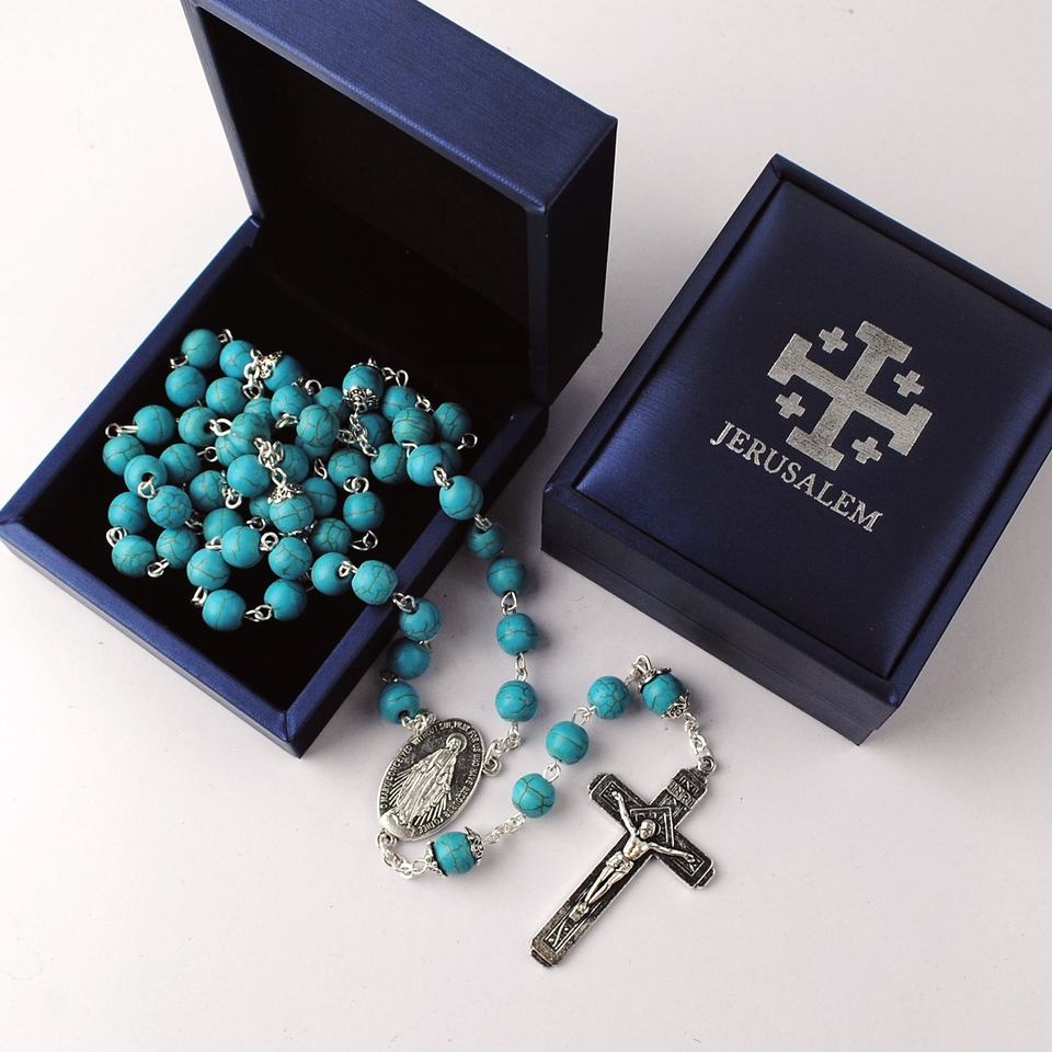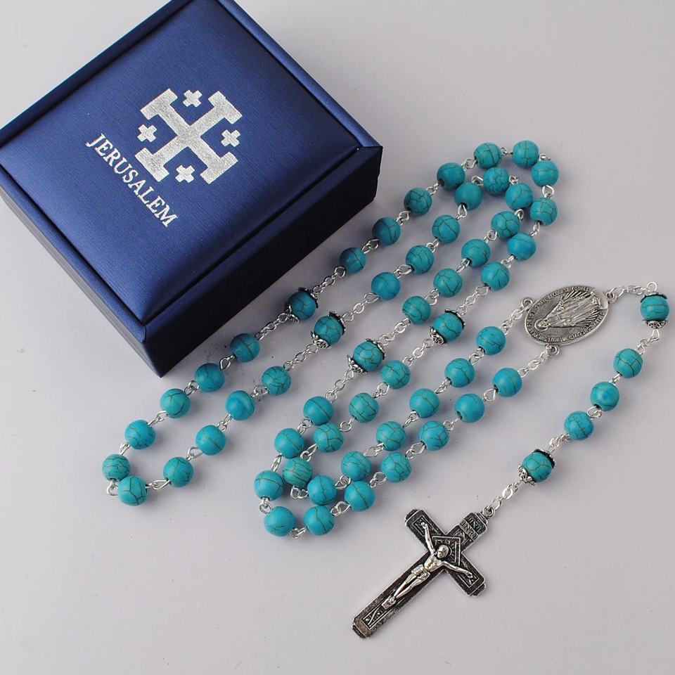 8mm turchese pietra perline rosario collana da uomo gioielli religiosi cattolici in argento placcato con scatola blu