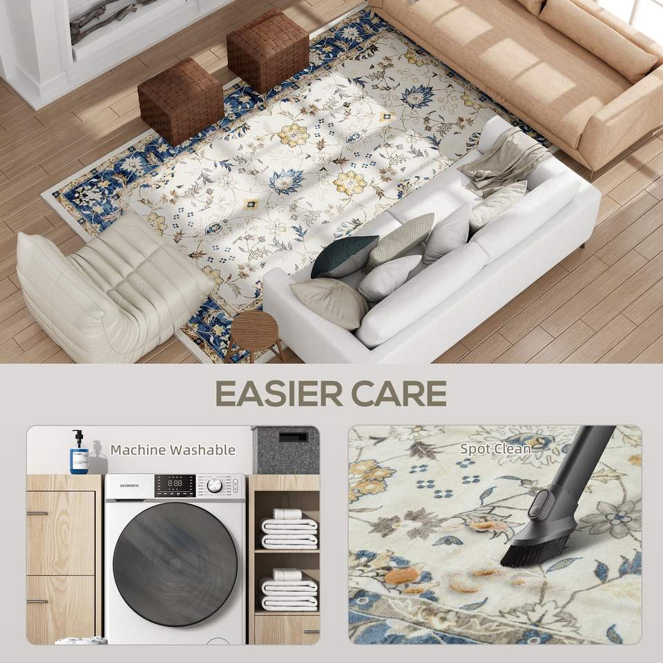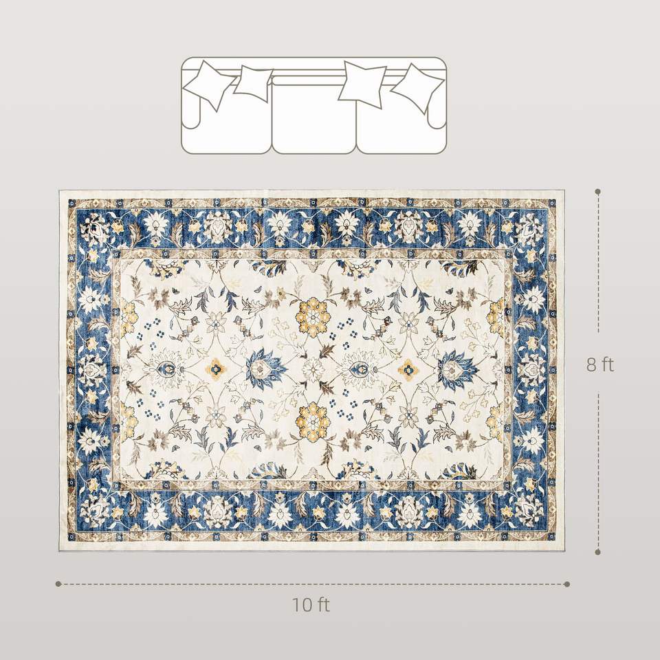 Tappeto Lavabile in Lavatrice 8x10 con Stampa Floreale Boho, Antiscivolo, Blu, per Soggiorno, Camera da Letto e Sala da Pranzo
