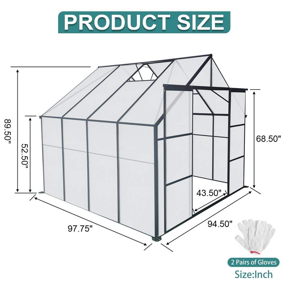 Casa in policarbonato a doppia porta resistente per tutte le stagioni da 8x8 piedi con Base rialzata in alluminio ancora nera Walk-in case sul retro all'aperto
