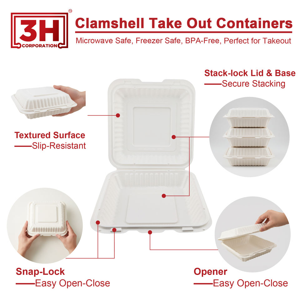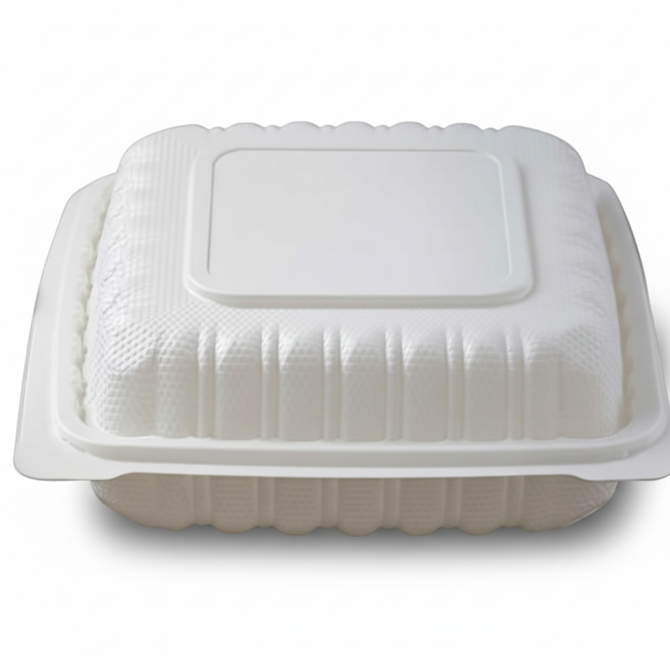 Contenitori a conchiglia bianchi 8x8 pollici (150 pz/scatola) con coperchio incernierato, adatti al microonde per la preparazione dei pasti, catering, asporto e food truck