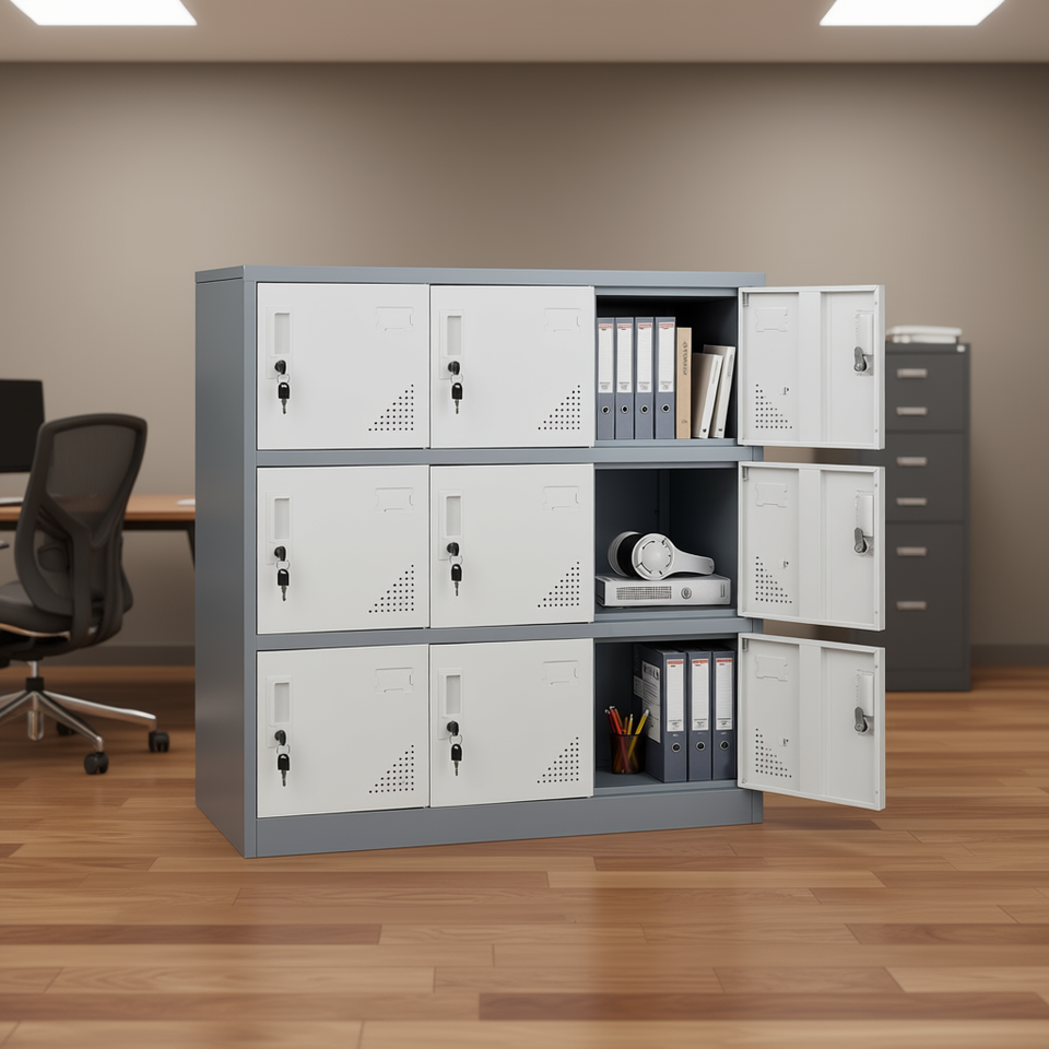 Armadietto in metallo grigio a 9 ante, mobiletto in acciaio a 3 livelli per ufficio, facile da montare, 35,4 x 17,7