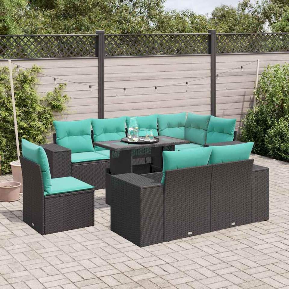 9 Piece Black Poly Rattan Garden Sofa Set with Cushions Patio Furniture Collection