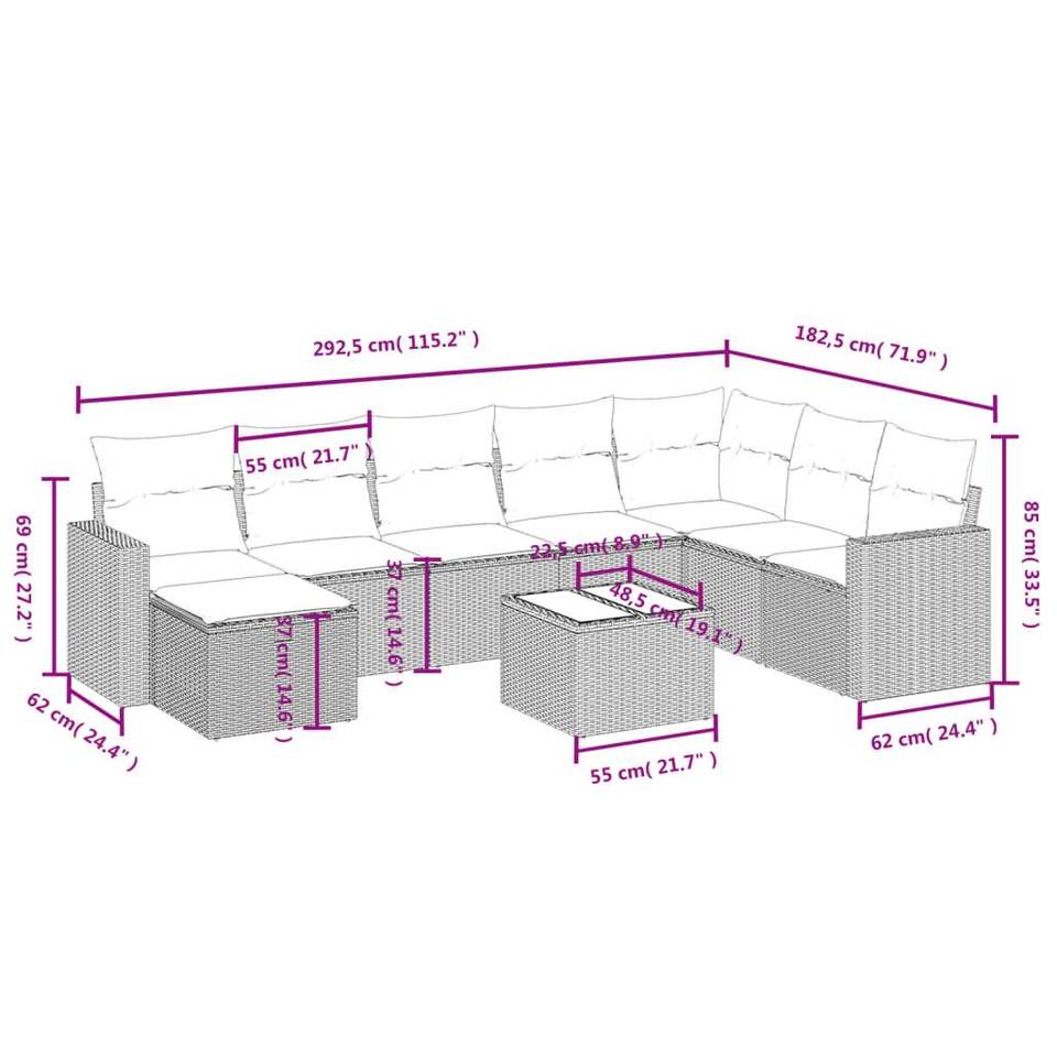 Set divano da giardino in Poly Rattan nero da 9 pezzi con cuscini divani da giardino