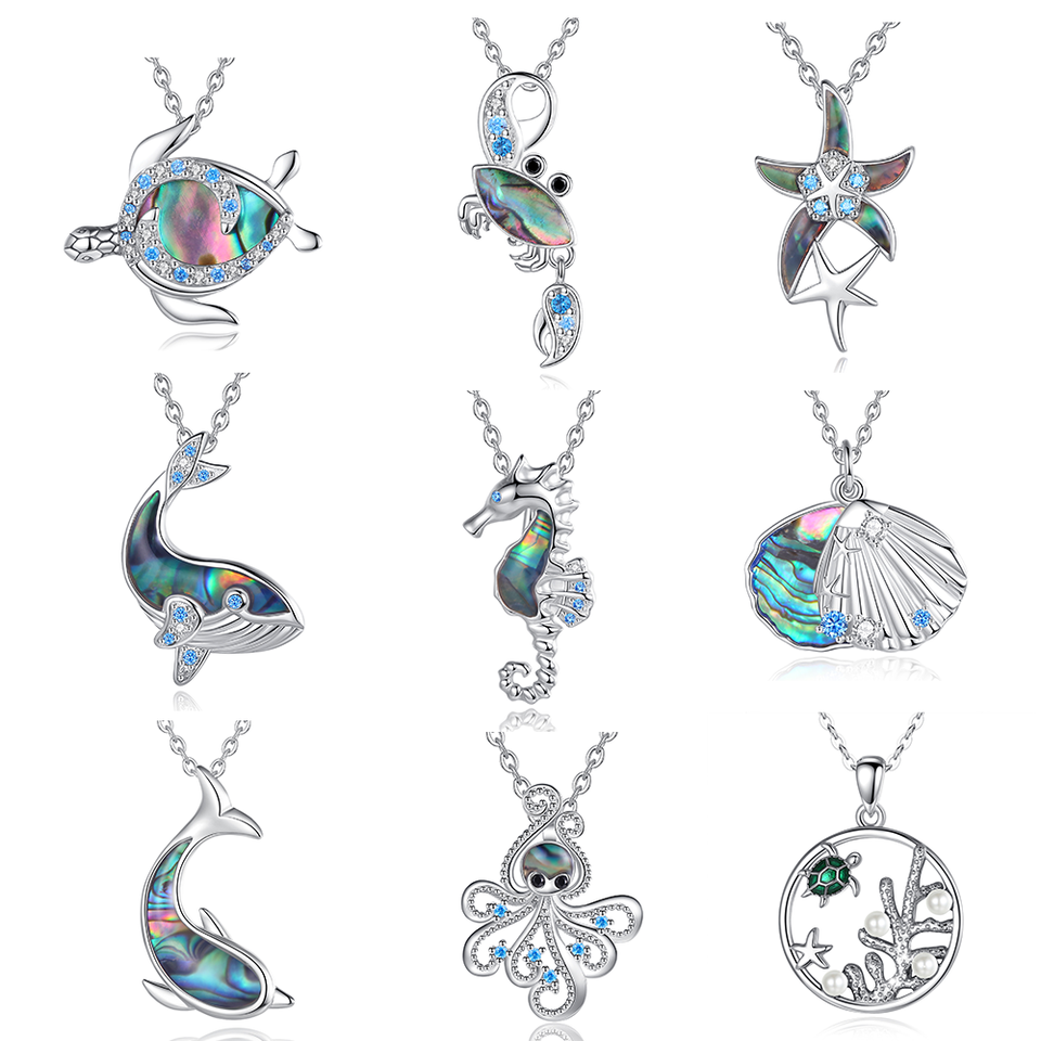 925 Sterling Silver Beach Hawaiian Sea Marine World Sea Horse Shell Starfish Turtle Jewelry Sea Themed Pendant Necklace