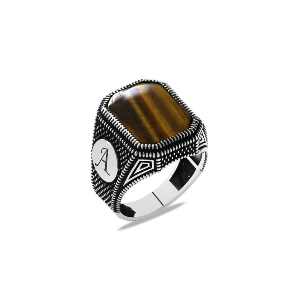 925 Sterling Silver Men's Ring with Dot Embroidered Tiger's Eye Stone and Personalized Name/Letters Written