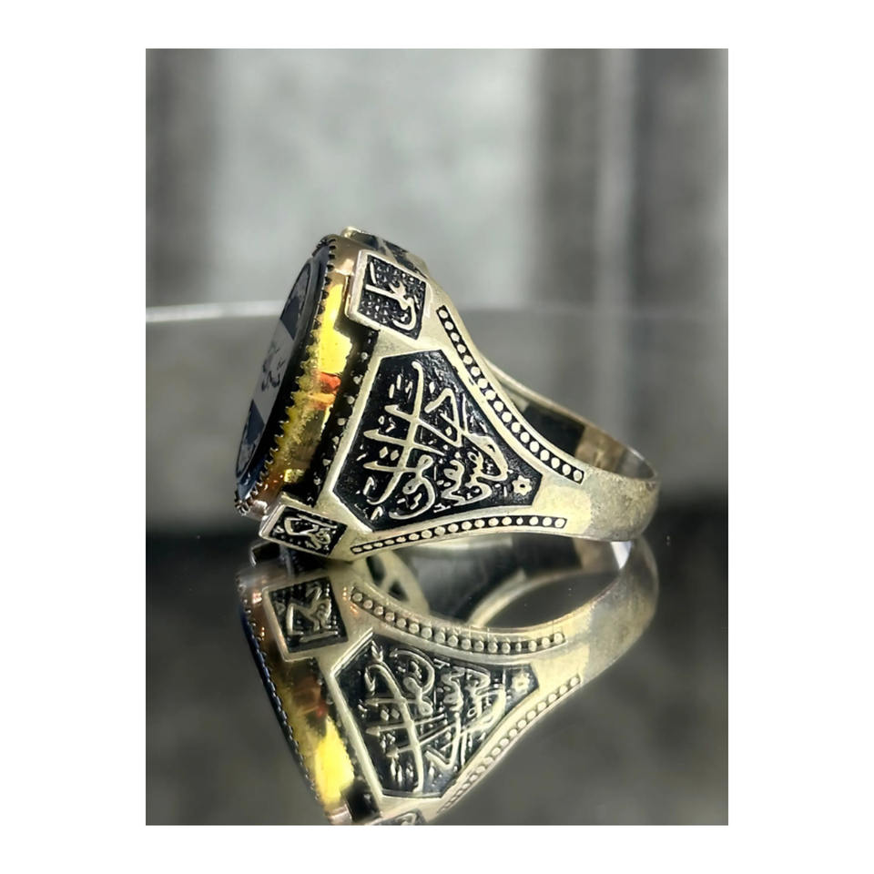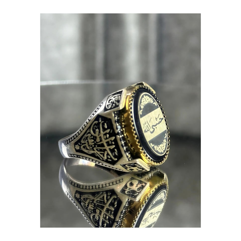 925 Sterling Silver Men's Ring with Black Stone, Engraved with the Names of the Four Caliphs and "Hasbiyallah"