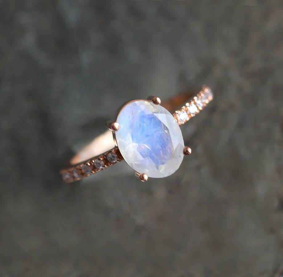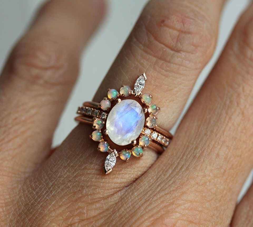 925 Sterling Silver Natural Moonstone and Opal Gemstone Engagement Ring Jewelry