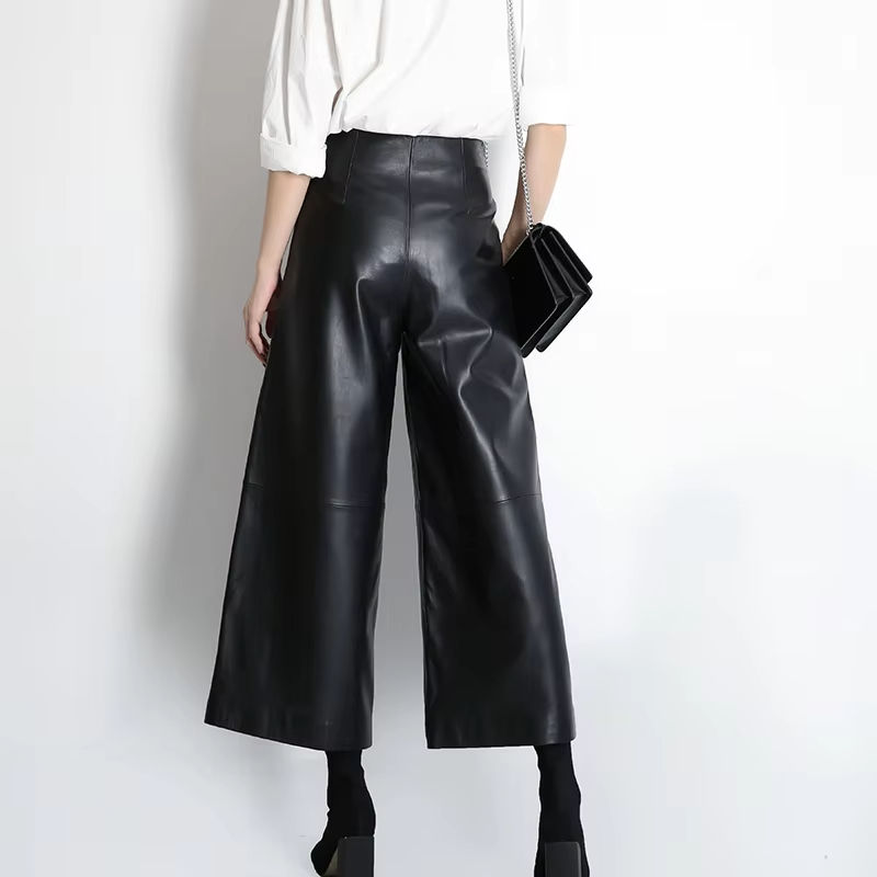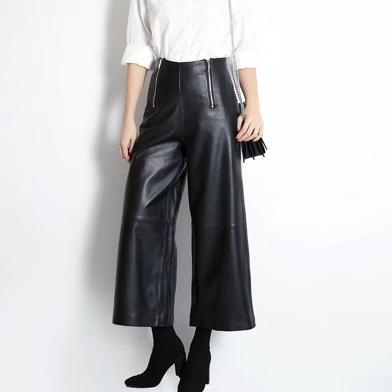 9601 l'alta qualità classica donna pantaloni larghi neri in vera pelle di pecora pantaloni di vera pelle per le donne
