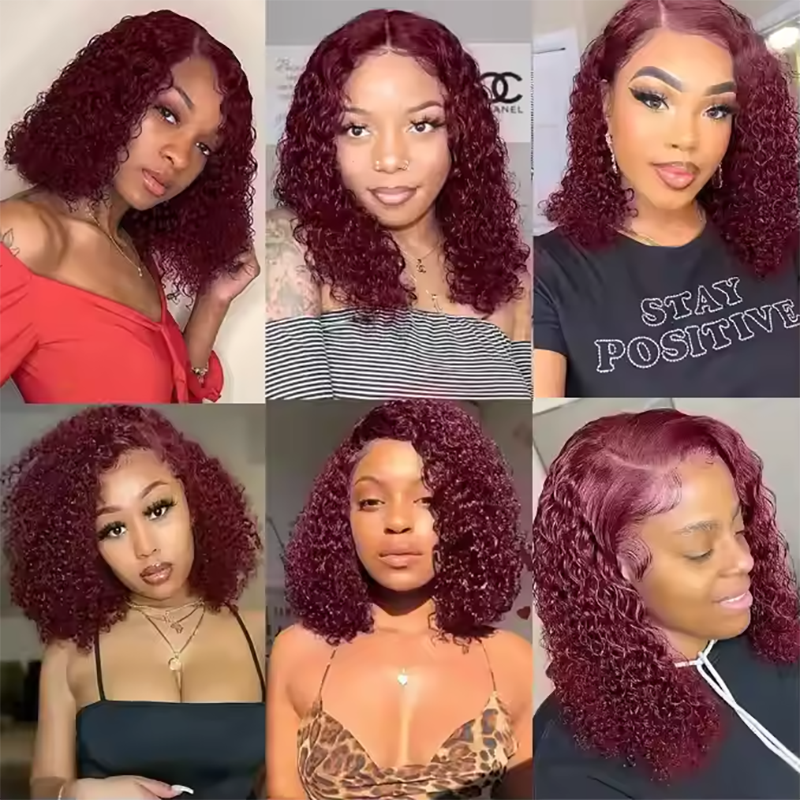 Parrucca Bob Corto Ricci Crespi Borgogna 99J in Capelli Umani Brasiliani Remy, Densità 180%, Calotta Piccola, Frontale in Pizzo Trasparente 13x4 per Donna