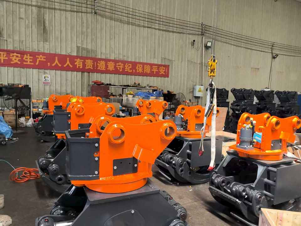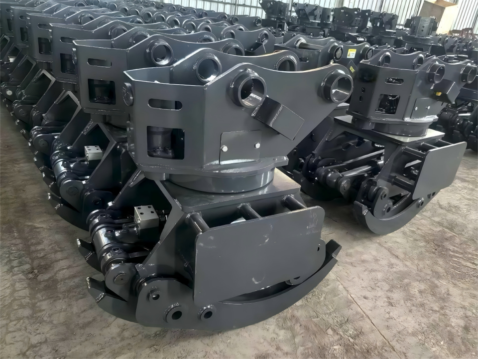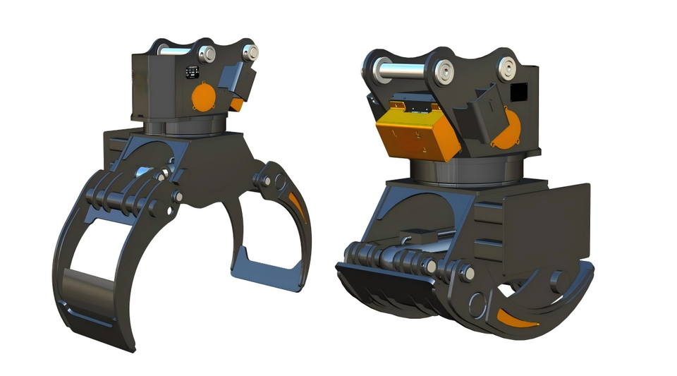 A 12-ton Excavator with a 360-degree Rotating Log Gripper Makes Picking up and Stacking Logs Much Easier