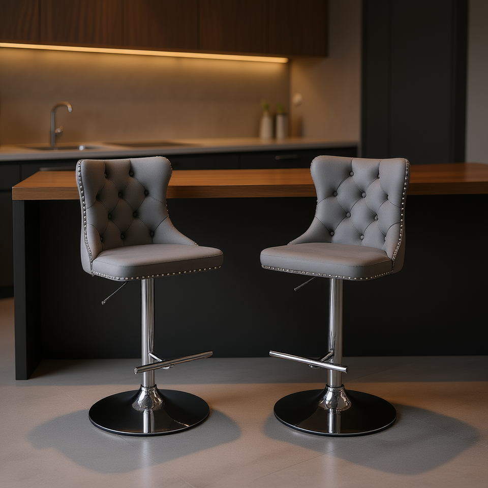 Set di 2 Sgabelli da Bar Grigi Trapuntati, Moderni con Base Cromata, Altezza Regolabile 25-33 Pollici, per Bar