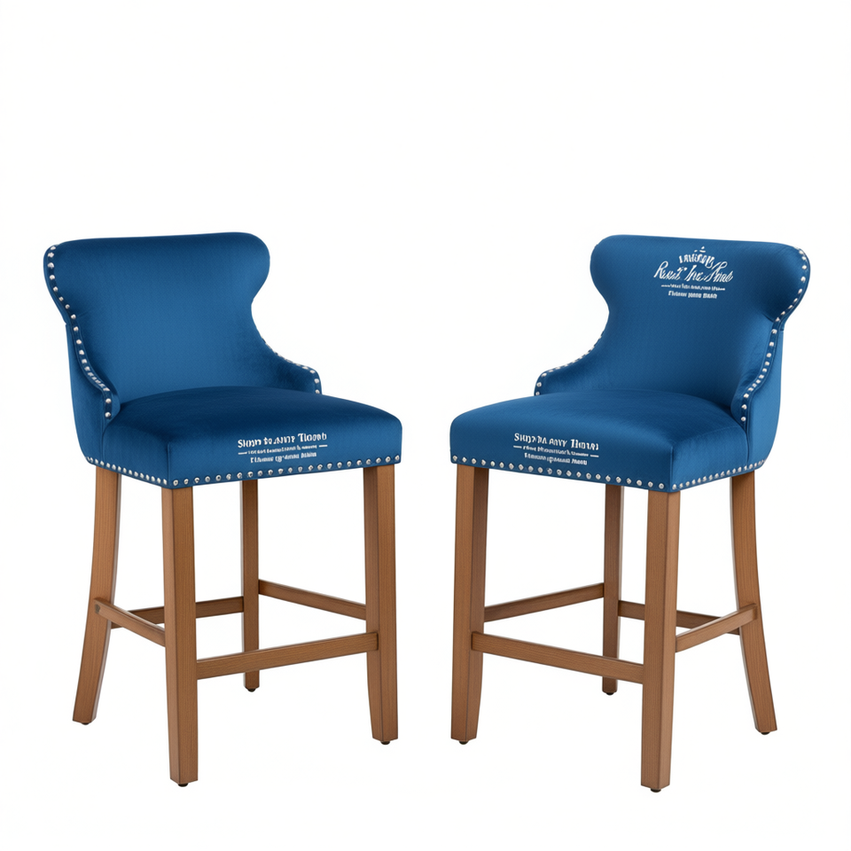 Contemporary Wing Back Barstools Blue Velvet Upholstered Wooden Legs Chrome Nailhead Trim Set Of 2