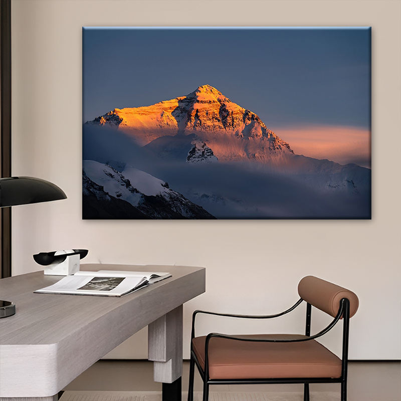 Una splendida stampa su tela con una mozzafiato vista al tramonto sul Monte Everest, paesaggio nepalese, perfetta per la decorazione.