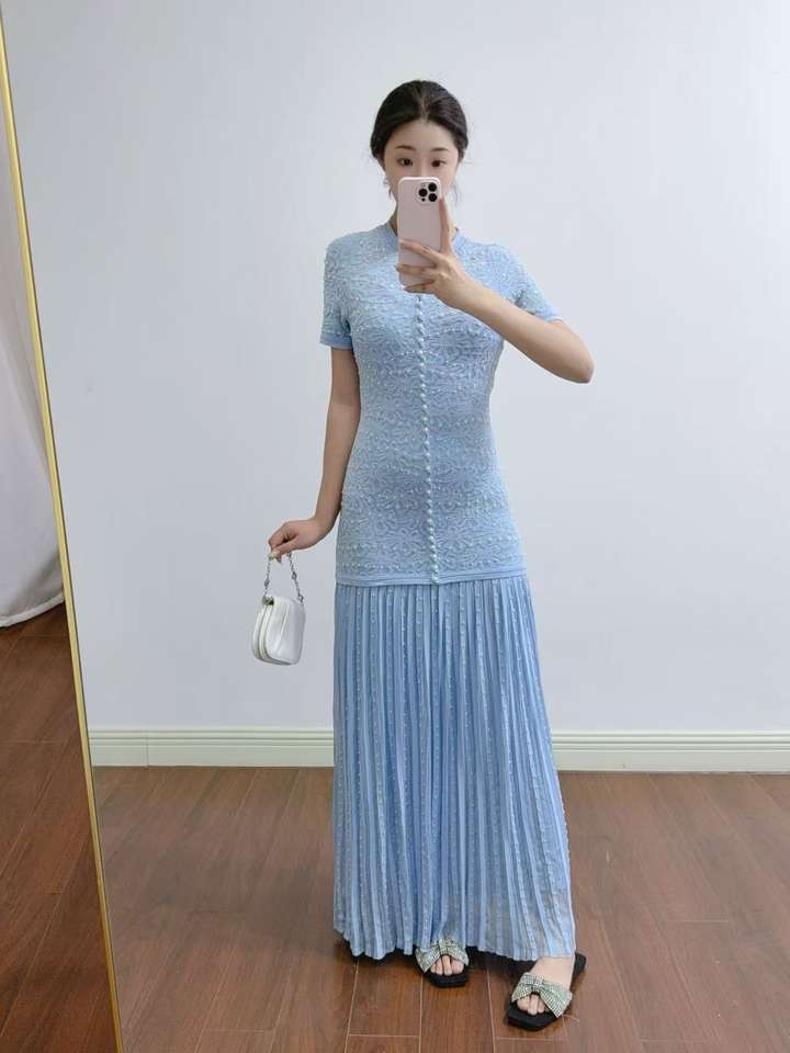Abito in maglia a maniche corte con motivi floreali perlati per la primavera, con vestito interno a collo alto, ideale per le socialite.