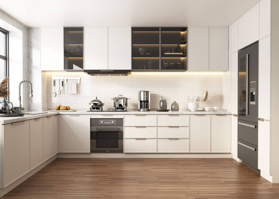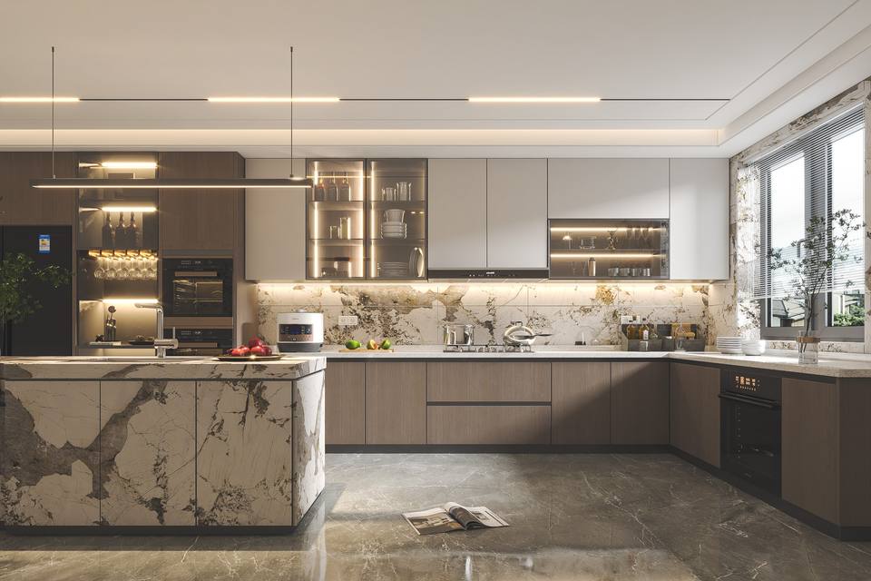 Mobile in Stile Moderno con Ripiani in Vetro, Ampio Spazio Interno e Armadi da Cucina in Legno su Misura