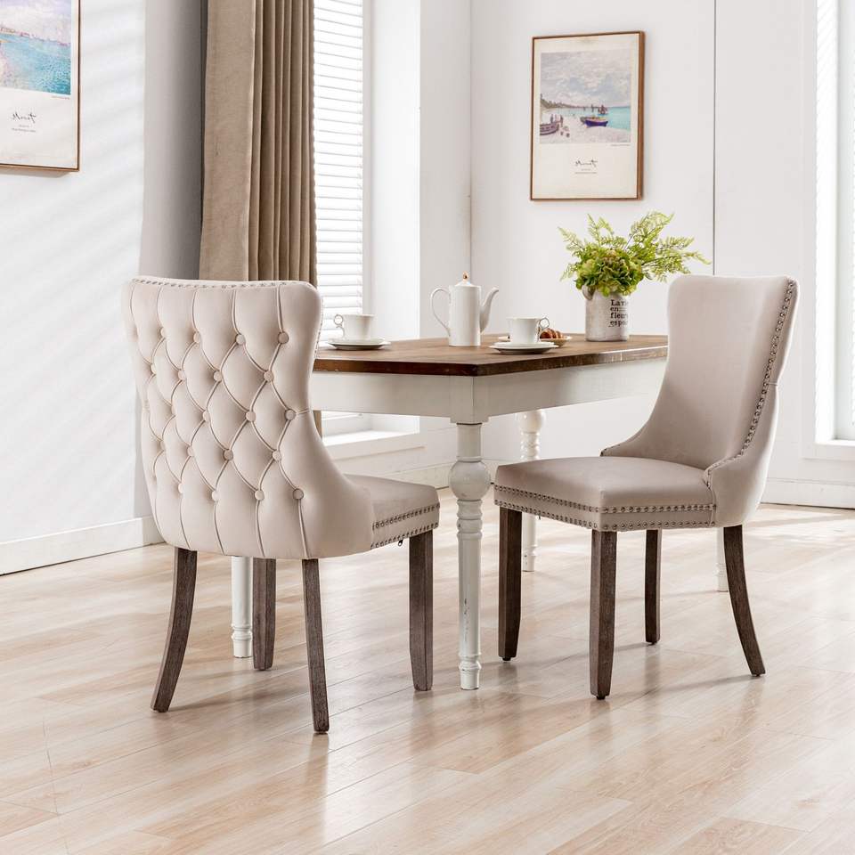 Set di 2 Sedie da Pranzo Beige con Schienale Alto, Imbottite con Cuciture a Contrasto, Finitura con Borchie e Gambe in Legno Massello SW880