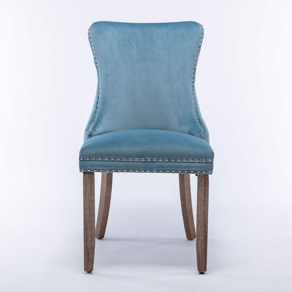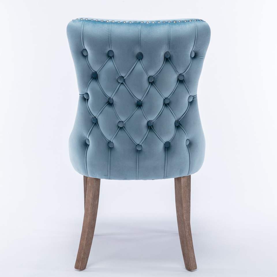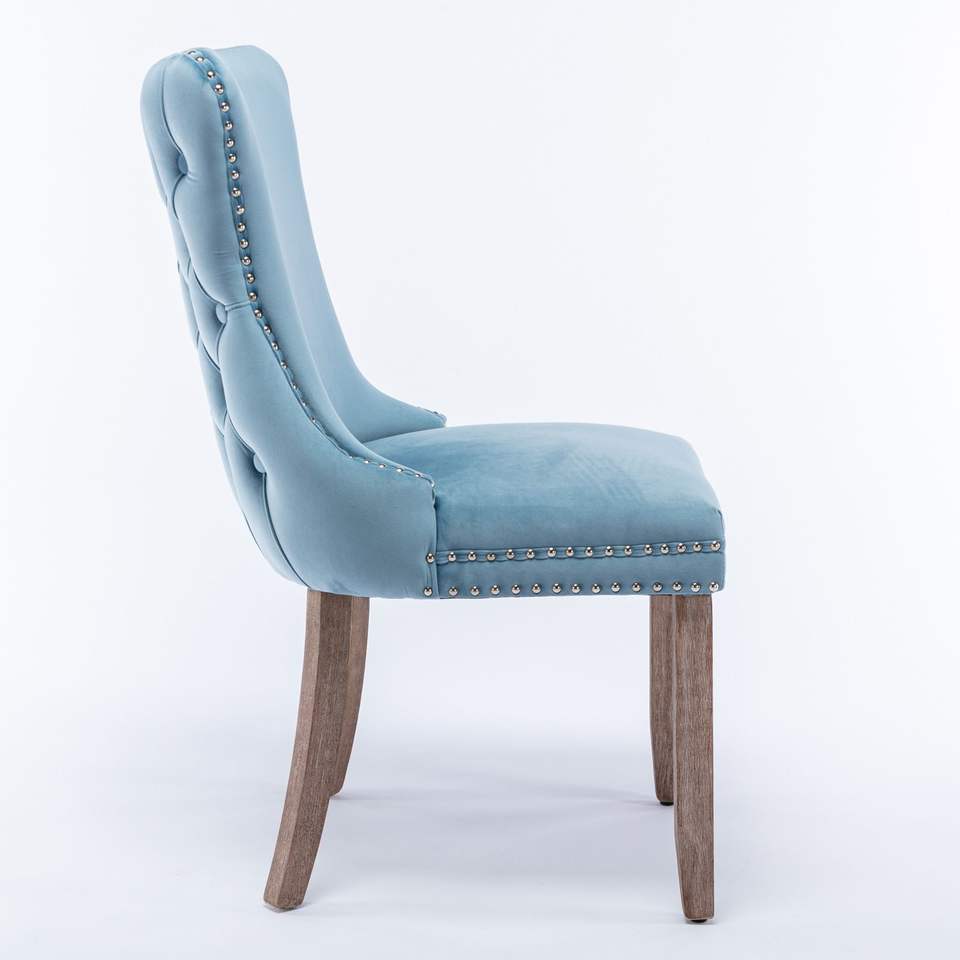 Set di 2 Sedie da Pranzo Azzurre con Schienale Alto, Imbottite con Cuciture a Contrasto, Finiture con Borchie e Gambe in Legno Massello