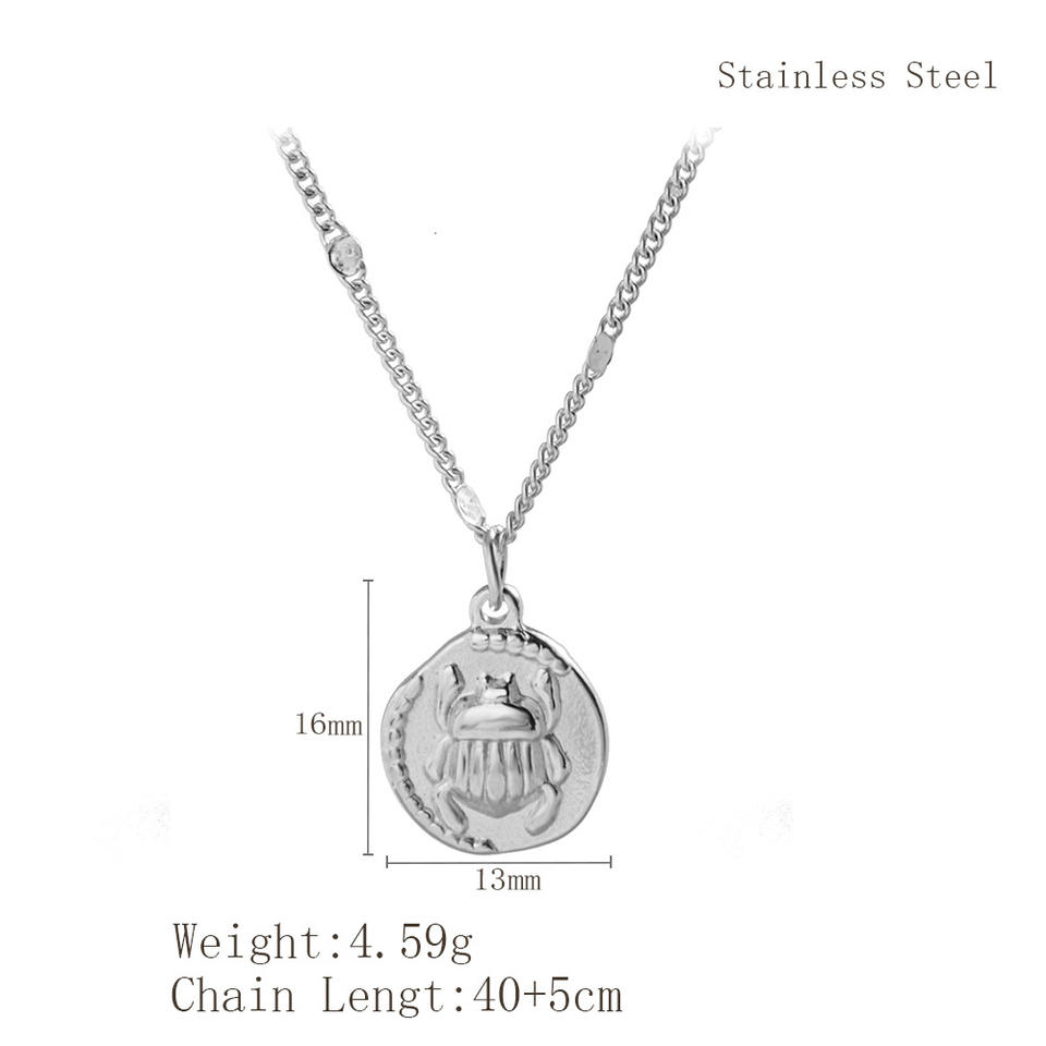 Una piccola collana con ciondolo rotondo di antico scarabeo egiziano, un ciondolo personalizzato in acciaio inossidabile e una clavicola
