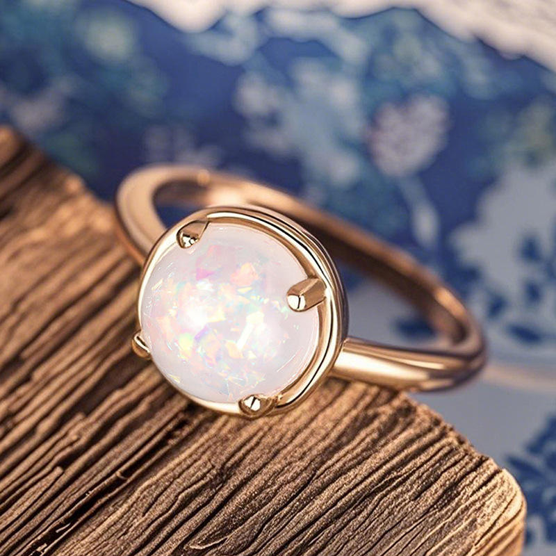 Anello in Opale A012 con Montatura a Griffe Rotonde, Placcato in Oro Giallo, Gioiello di Fidanzamento per Donne