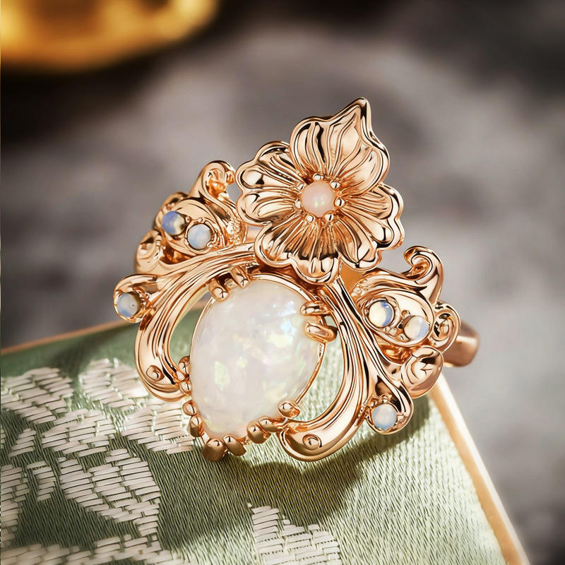 A063 Women's Opal Ring Flower Design Prong Setting Natural Pear Stone Wedding Fashion Jewelry