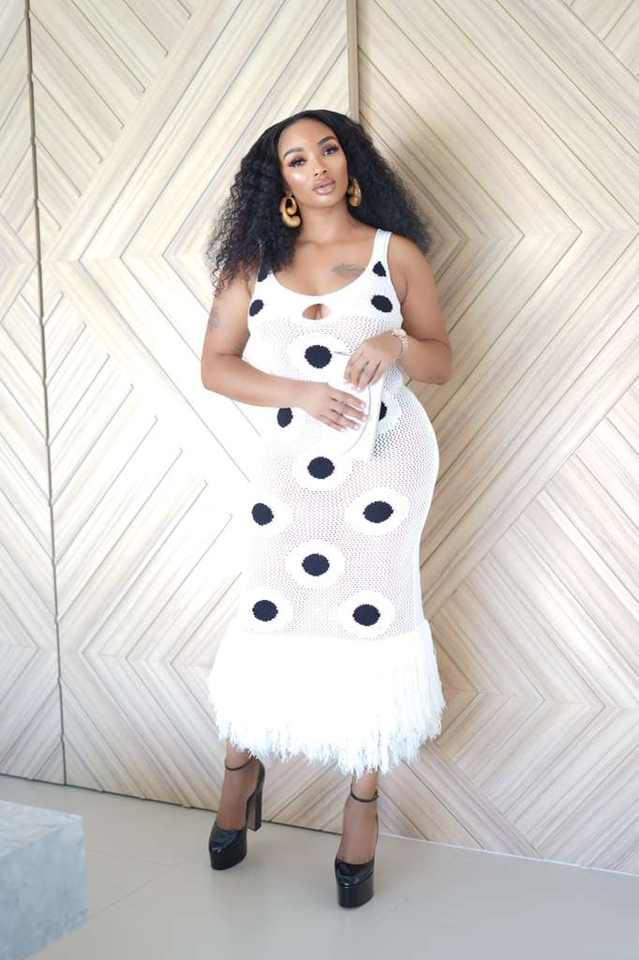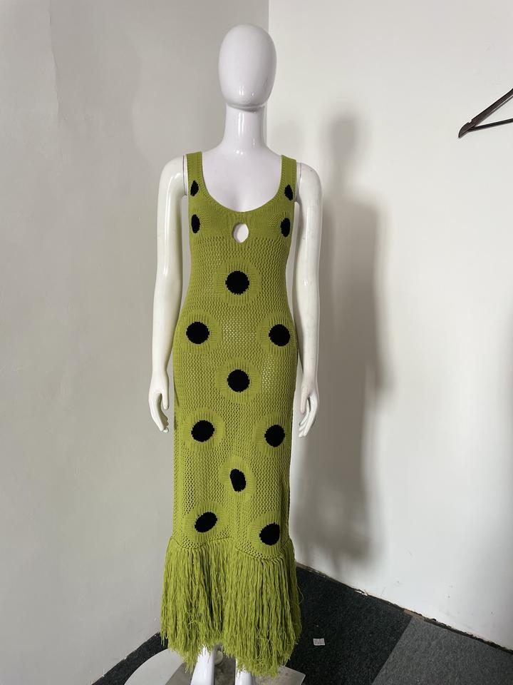 A10558 Migugarment New Fashionable Casual Dress for Lady Tassel Black Dot Embellishment Knitted Maxi Dress Summer 2025 Hot Sale