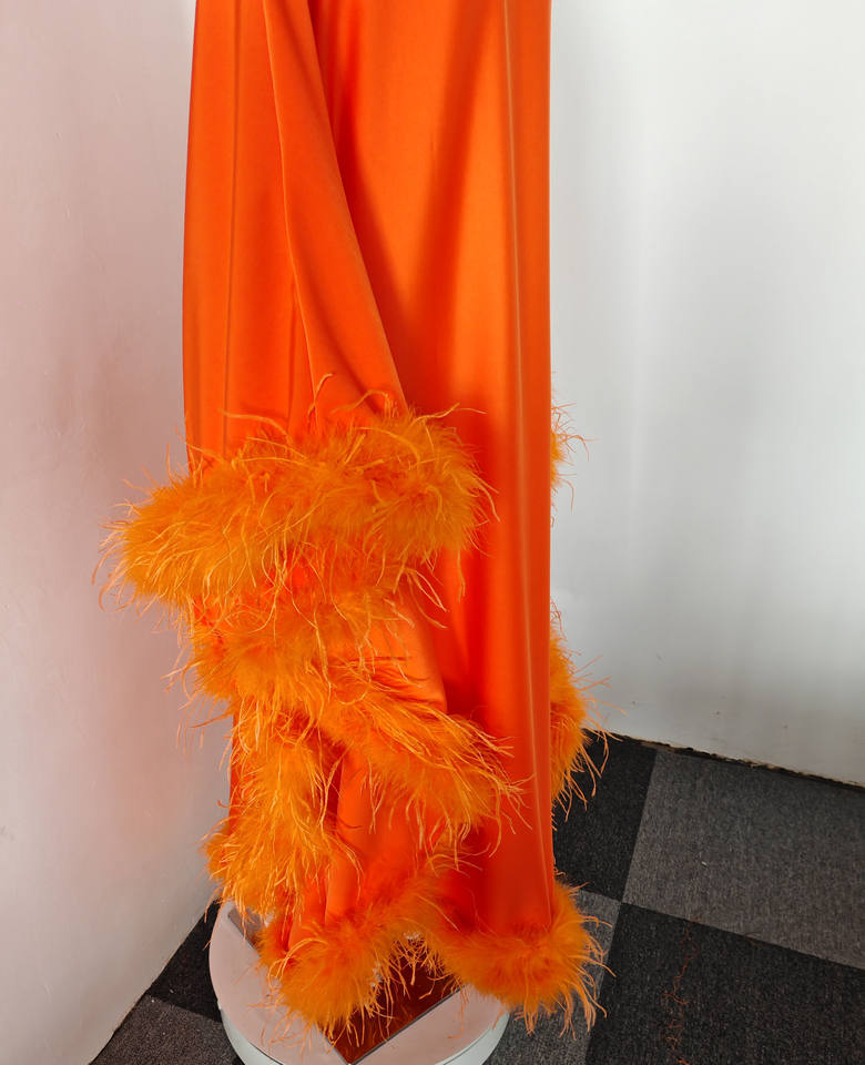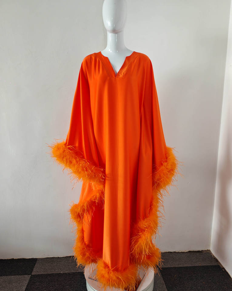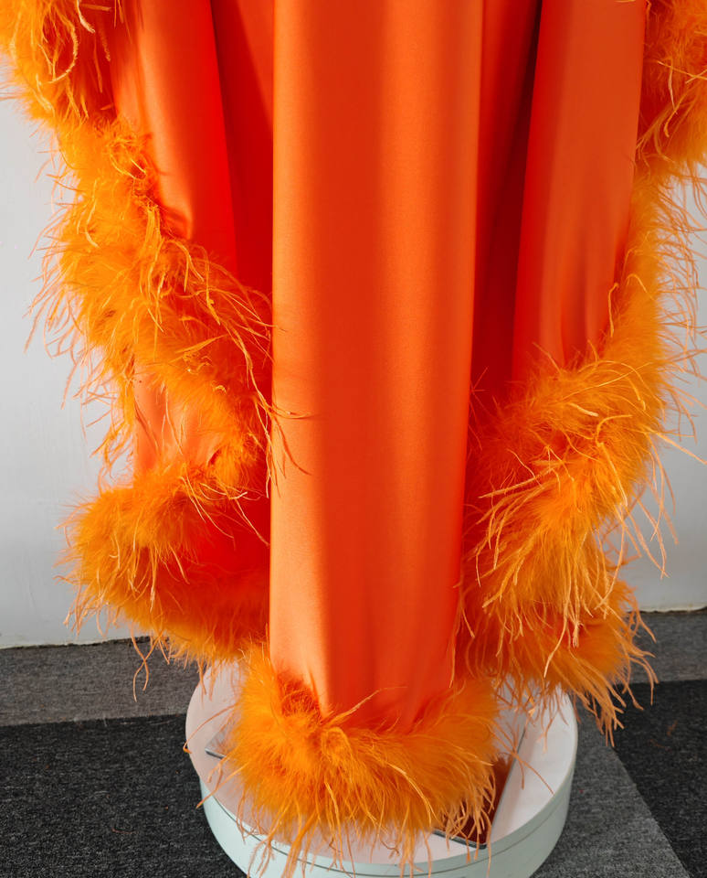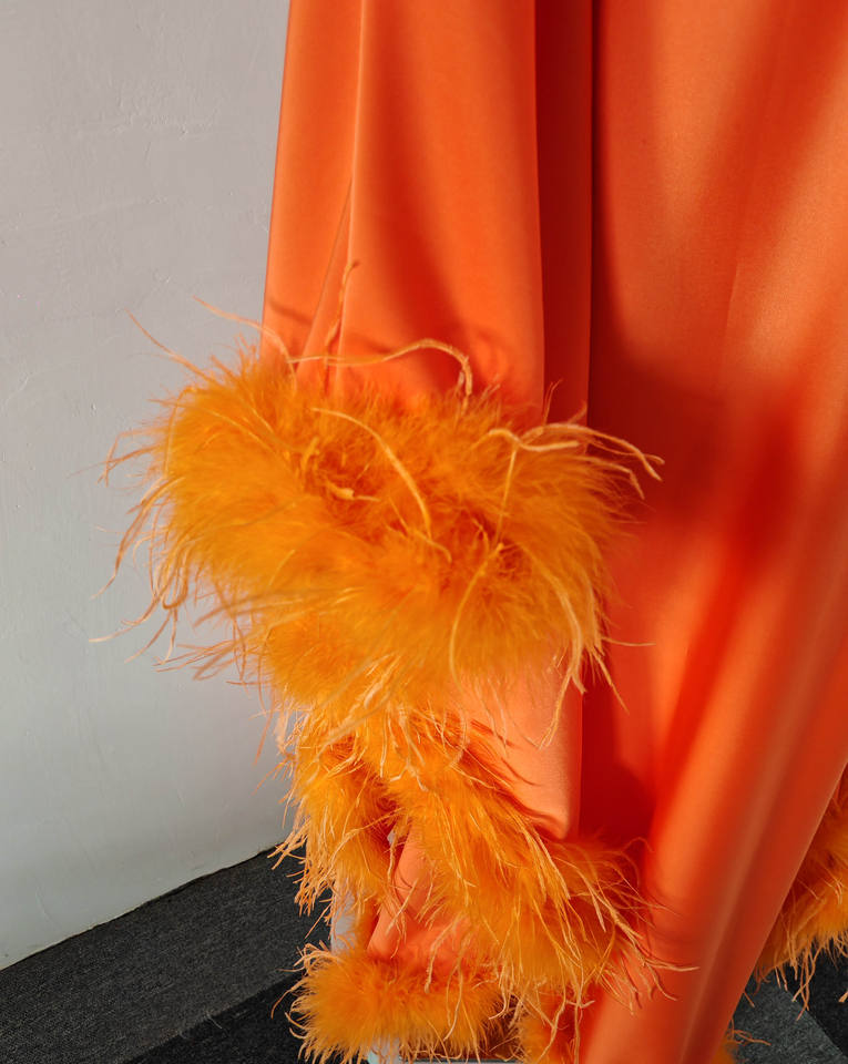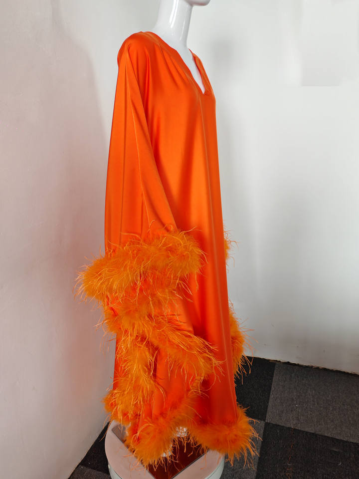A10843 Abito da Donna Tinta Unita Arancione con Scollo a V, Vestito Comodo e Ampio con Finiture in Piume, Elegante Abbigliamento da Sera