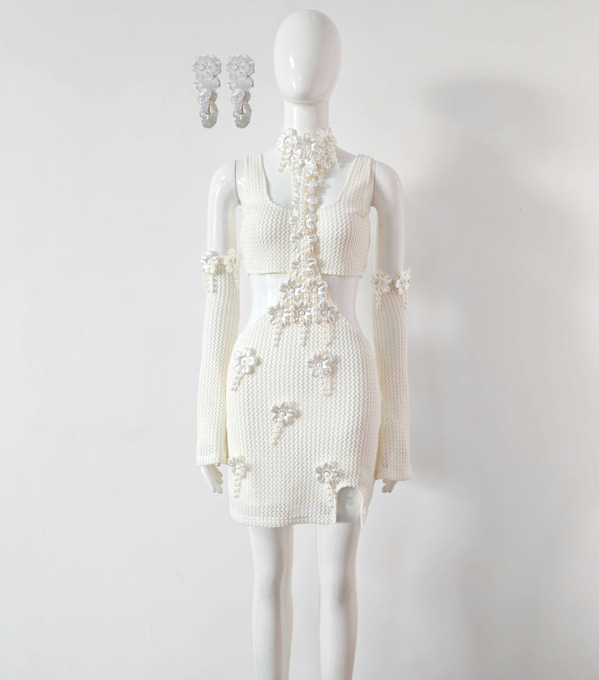 A11261 Set Bianco in Maglia 4 Pezzi: Top Corto Traforato con Decorazioni Floreali di Perle e Minigonna - Elegante per Feste/Cocktail con Maniche a Campana