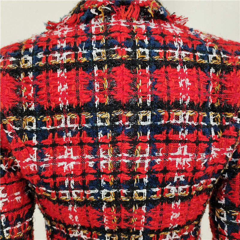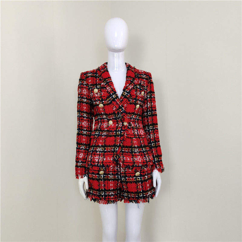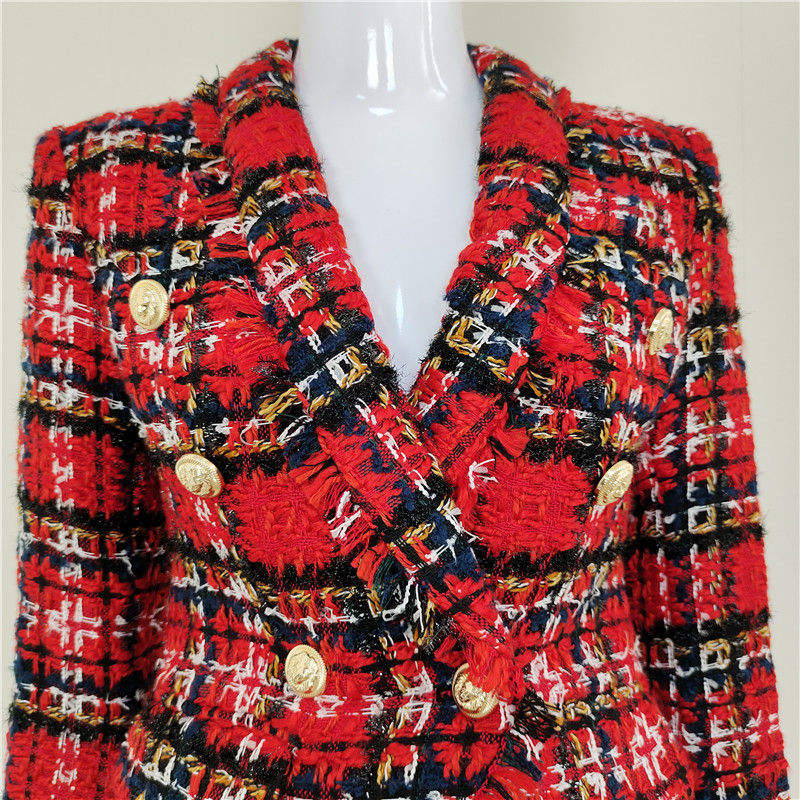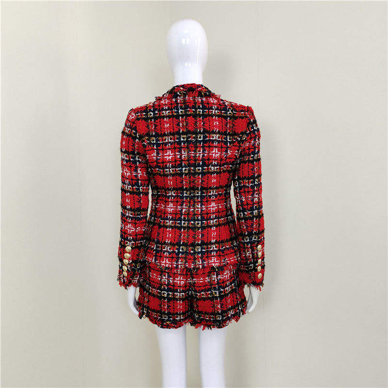 A4389 Classico Rosso Doppiopetto con Nappe Tweed Scozzese Anti-Pilling Lana/Poliestere Donna XS Set Invernale Due Pezzi al Ginocchio - Blazer