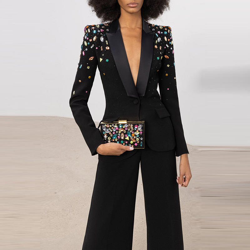 A7450 Migugarment Drop Shipping blazer di strass di colore nero e pantaloni lunghi due pezzi Set formale ufficio da donna abiti da donna