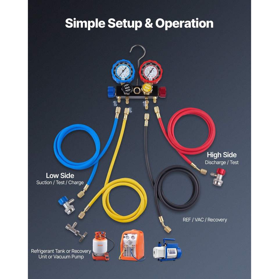 Set di Manometri AC D0100X3K1I8 per R134a R404A R1234yf R22, 4 Vie con Tubi da 5 Piedi, Adattatori e Attacchi Rapidi