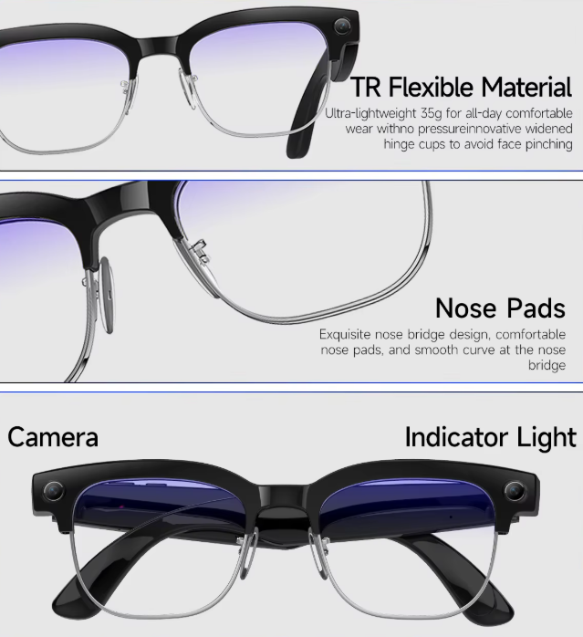 Occhiali Intelligenti AI con Funzionamento a Scorrimento, Lunga Durata della Batteria, Ultra Leggeri, Traduzione, Lenti Rimovibili e Personalizzabili