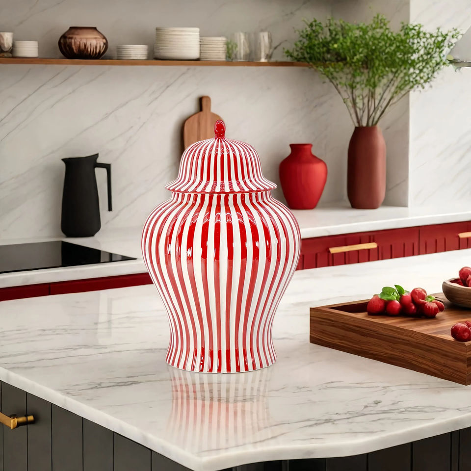 AJ001 2025 Christmas Decoration Red and White Striped Ginger Jar Home Decor Ceramic Vase Candy Cookie Jar with Lid