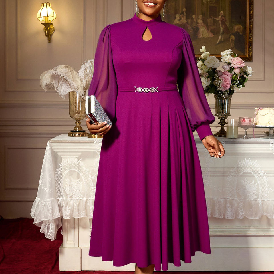 AM050651 Elegant Fall Stand Collar Cut Out Chiffon Long Lantern Sleeve A-line Purple Midi Plus Size Formal Women's Casual Dress