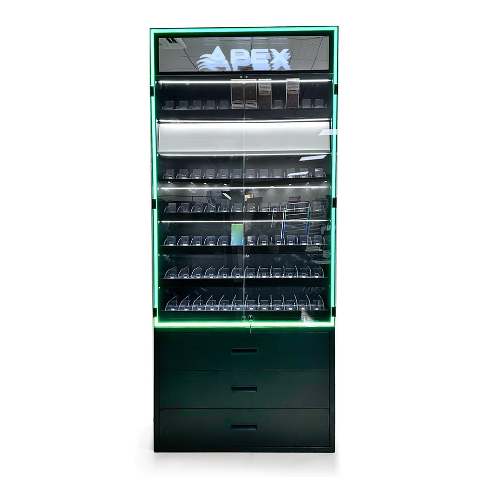 APEX Retail Tobacco Display and Gas Station Cigarette Display with Sliding Doors LED Lighting and Acrylic Push-Feed Shelves
