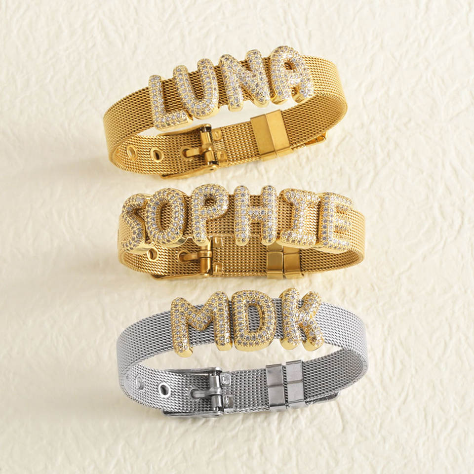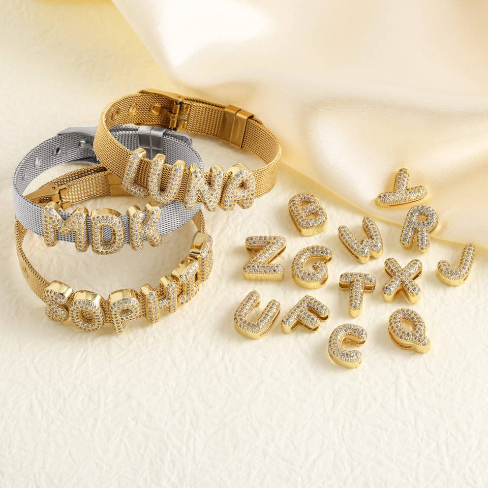 ASJEWELRY BRTB35 – Bracciale fascia larga 26 lettere per donna, ottone e rame placcati oro, oro/argento, zirconi AAA, 15–19 cm