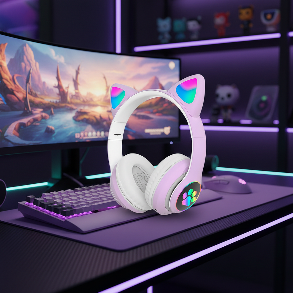 Cuffie Myrva a Orecchie di Gatto, Wireless Bluetooth 5.3, Luce RGB, Audio Stereo per Gaming, Controllo Touch, Ricarica Type-C