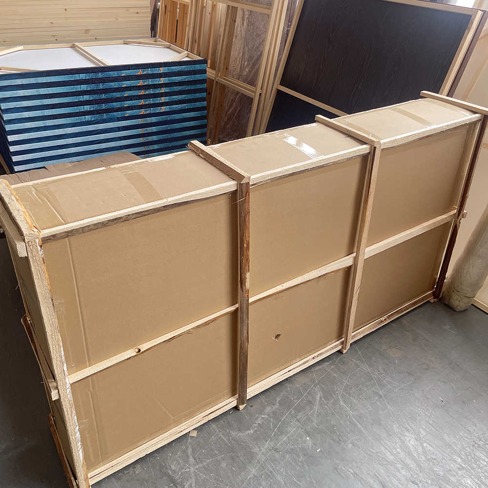 Avvolgi i quattro angoli del dipinto con un equipaggiamento protettivo e poi coprili con uno strato di sacchetto di plastica. Per i dipinti in sovrappeso, li imballeremo prima con cartoni e schiuma anticollisione, quindi faremo una pittura di protezione del telaio con legno intorno ai cartoni.