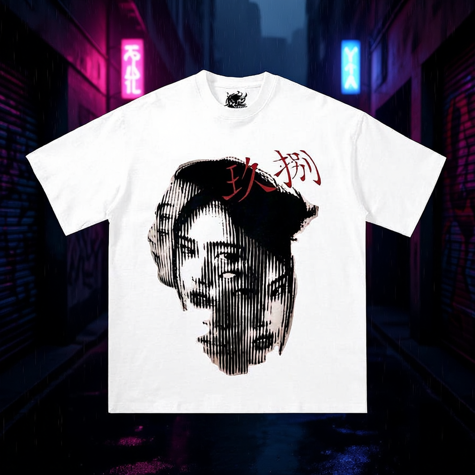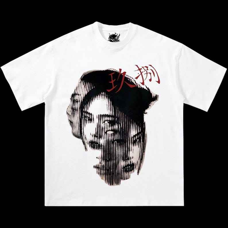 T-shirt squadrata con grafica giapponese astratta, design oversize streetwear Y2k
